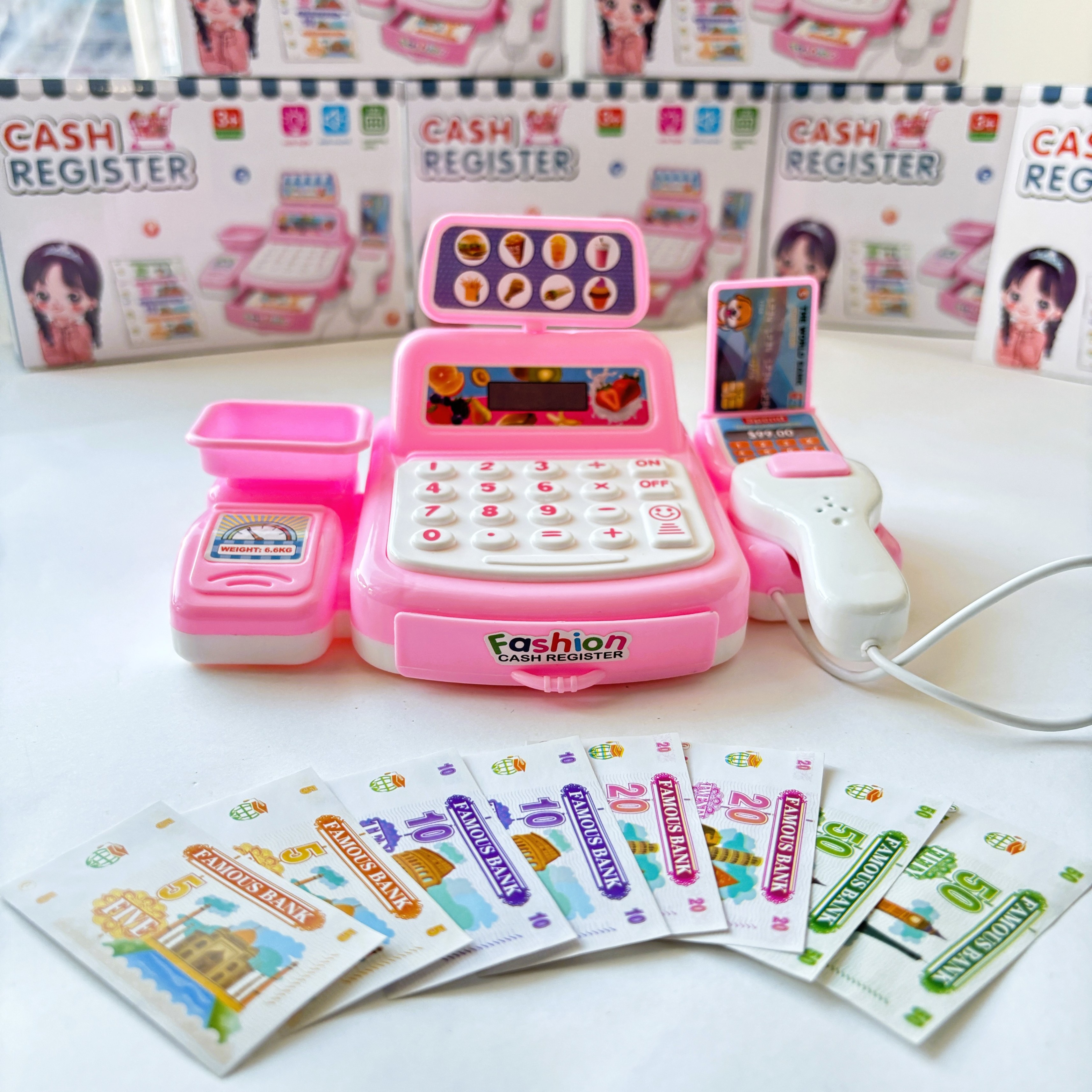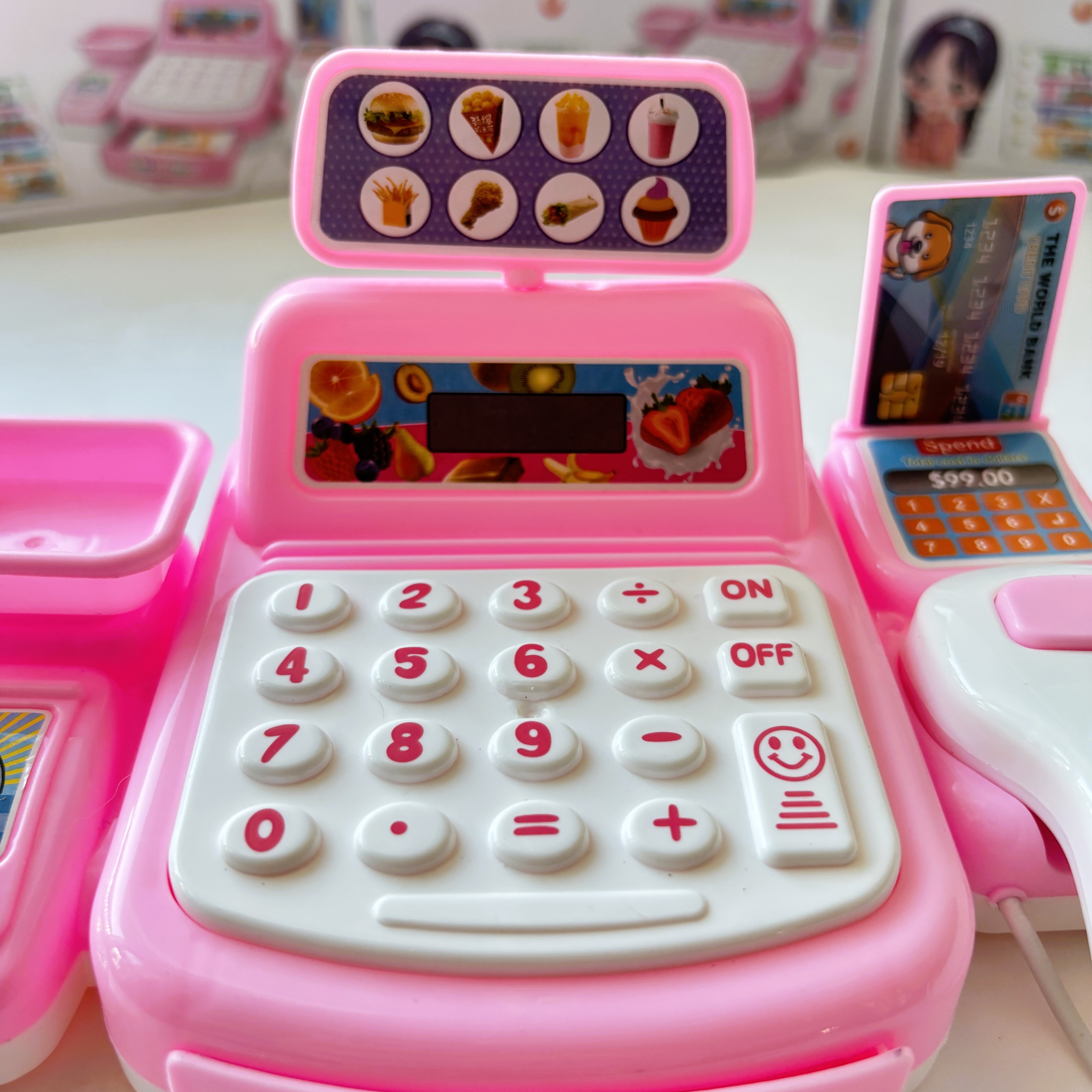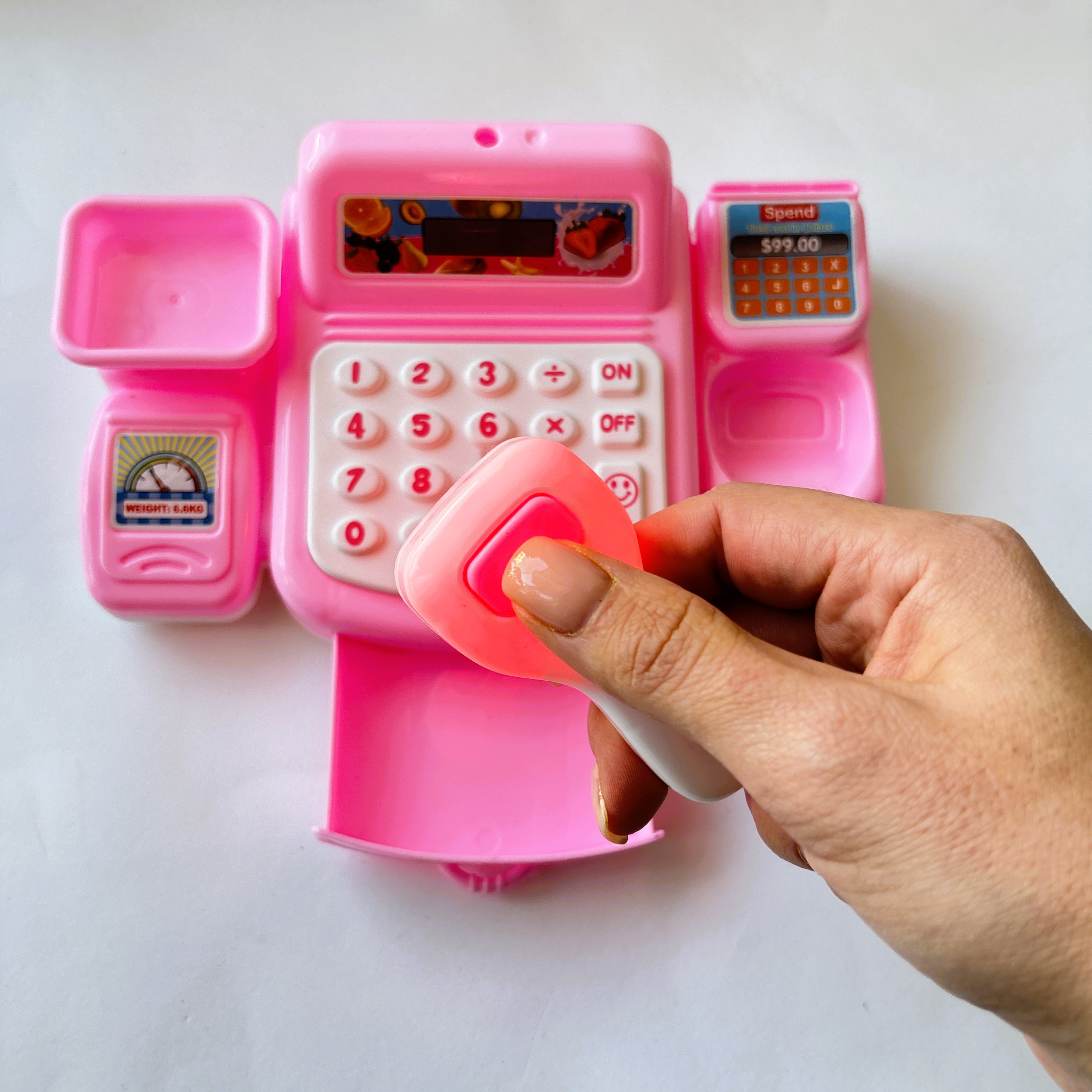 Zabawka posiada efekty dźwiękowe i świetlne – skaner świeci na czerwono i wydaje dźwięk „pik”, zupełnie jak prawdziwy! Do zestawu dołączono banknoty i kartę kredytową, co sprawia, że zabawa jest jeszcze bardziej realistyczna.